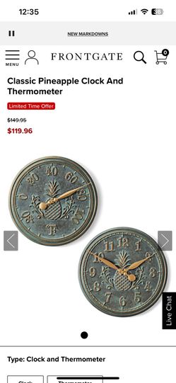 16” Diameter Classic Pineapple Clock and Thermometer Set, Cast Aluminum. Brand new OEM hands and mechanisms installed in both units on 4/14/24. $30Chula Vista, CA