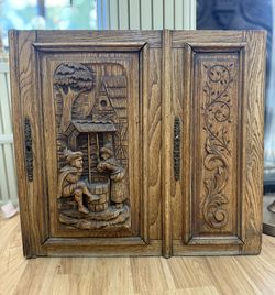 Hand-Carved Wooden Panel Display – European Folk Art Scene & Ornate Floral Detailing$100Pasadena, CA