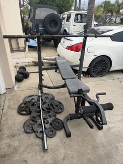 Bench press with 7ft 35lbs bar and 215lbs of Olympic weights and curl bar$310Moreno Valley, CA