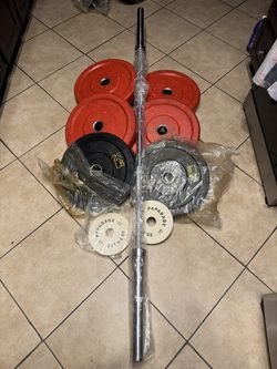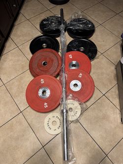 Olympic bumper weights 354lbs total plus brand new 7ft 45lbs bar$360Moreno Valley, CA
