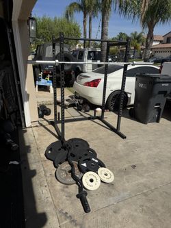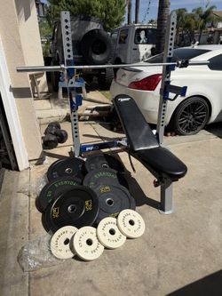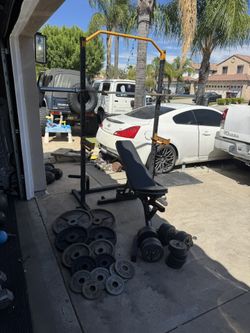 Bench press/squat rack with 7ft 45lbs bar plus 250lbs of Olympic weights and curl bar$300Moreno Valley, CA