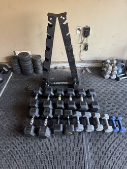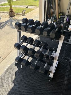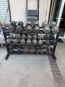 Dumbbells rubber hex 5-45lbs weights 430lbs total plus rack$460Moreno Valley, CA