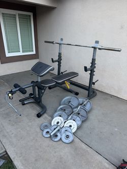 Bench press/squat rack with 7ft bar plus 250lbs of Olympic weights and standard weights with curl bar$360Moreno Valley, CA