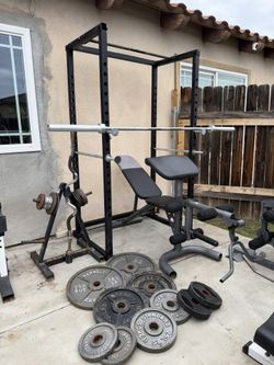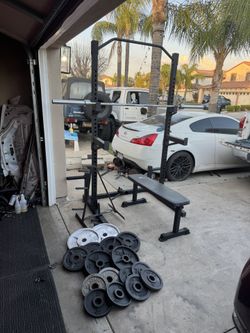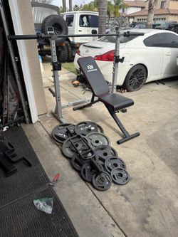 Bench press/squat rack with 7ft 40lbs bar plus 255lbs of Olympic weights and curl bar$400Moreno Valley, CA