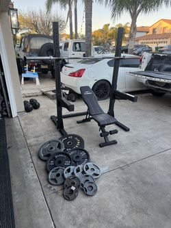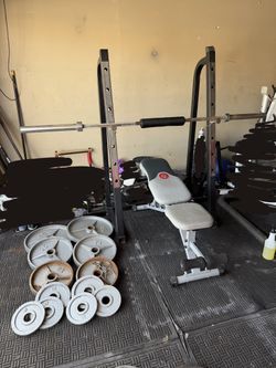 Bench press/squat rack with 7ft 45lbs bar plus 250lbs of Olympic weights$310Moreno Valley, CA