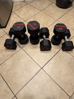 Brand new Ethos rubber dumbbells weights 60,55,and 45lbs pairs 1$ a pound firm price$300Moreno Valley, CA
