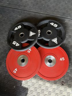 Commercial urethane Olympic weights 45lbs pairs$180Moreno Valley, CA