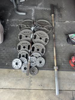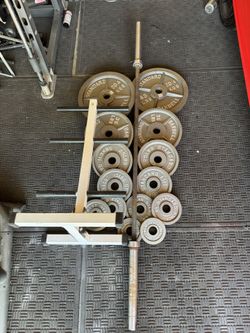 Olympic weights 255lbs total plus 7ft 45lbs bar plus weights tree firm price$280Moreno Valley, CA