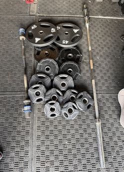 Olympic bumper weights 300lbs total plus brand new 7ft 45lbs bar firm price$400Moreno Valley, CA