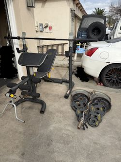 Bench press/squat rack with 7ft bar plus 240lbs total plus curl bar$360Moreno Valley, CA