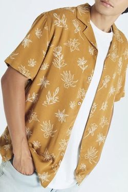 A rayon twill shirt featuring allover floral line art graphics, Cuban collar, bu$25Woburn, MA