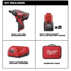 Milwaukee M12 12V Lithium-Ion Cordless 1/4 in. Hex Screwdriver Kit with Two 1.5Ah Batteries, Charger and Tool Bag$100Houston, TX