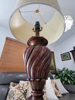 Traditional Regency Hill brand table lamp, Regio model, with a carved urn-shaped base in aged brown and a beige fabric shade. / 33182$20Miami, FL