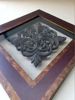Set of two wall art objects, heavy metal decorative with a wooden frame, similar to vintage brass wall art styles from the 1990s. / 33182$40Miami, FL