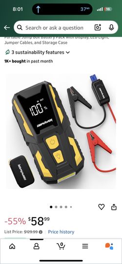 DBPOWER 5000A Jump Starter, 74Wh Car Battery Jump Starter for Up to 10.0L Gas and 8.0L Diesel Engine, 12V Portable Jump Box Battery Pack with Display,$55Laguna Hills, CA