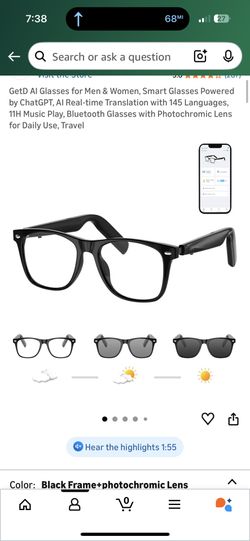 GetD AI Glasses for Men & Women, Smart Glasses Powered by ChatGPT, AI Real-time Translation with 145 Languages, 11H Music Play, Bluetooth Glasses with$55Lake Forest, CA
