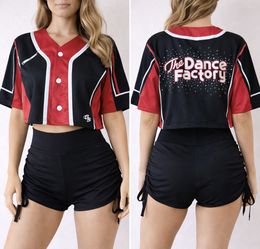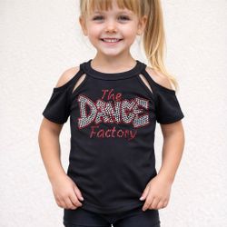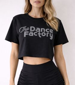 Black cropped dance top with rhinestone “The Dance Factory” logo.$25Rancho Palos Verdes, CA