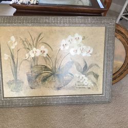 4 art floral panels, 2 oyster polish ebony varnished vases with stands$25Alafaya, FL