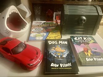 Red Maisto 2013 Dodge Viper GTS SRT Diecast Car, Wood Treasure Chest, Brand New Hardback Dog Man, New Cat Kid Book, & Desktop Shark $40Encinitas, CA