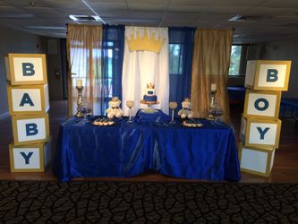 Baby shower decorations. Gold Candle Holders, Blue and Gold Curtains, Royal Blue Satin Table Cover$1Pembroke Pines, FL