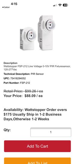 Wattstopper FSP-212 Line Voltage 0-10V PIR Fixturesensor, 120-277Vac$60Phoenix, AZ