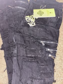 Black distressed denim jeans from the brand GUAPI, featuring multiple zipper accents and a stacked fit. $150Gainesville, FL