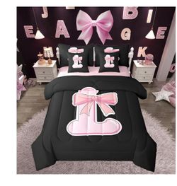 jejeloiu Kawaii Pink Bow Full Comforter Set with Sheets,Gifts for Women Teen Girl,Personalized Initial Letter L 7 Piece Bedding Set,Soft Monogrammed B$20Montebello, CA