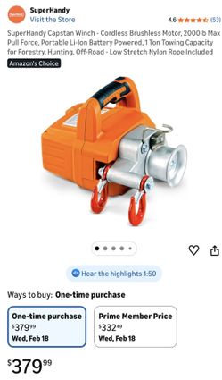 SuperHandy Capstan Winch - Cordless Brushless Motor, 2000lb Max Pull Force, Portable Li-lon Battery Powered, 1 Ton Towing Capacity for Forestry, Hunti$200Bakersfield, CA