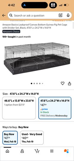 Amazon Basics Leakproof Canvas Bottom Guinea Pig Pet Cage with Divider Set, Black, 47.6"L x 24.2"W x 14.0"H$28Phoenix, AZ