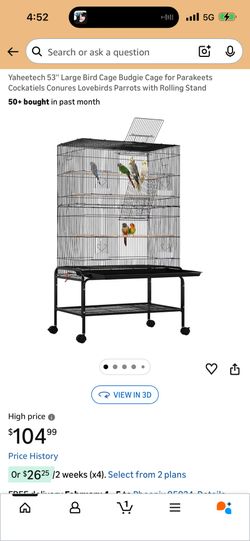 Yaheetech 53" Large Bird Cage Budgie Cage for Small Birds Comes With Two Toys And Free Bag Of Parakeet Food with Rolling Stand$92Phoenix, AZ