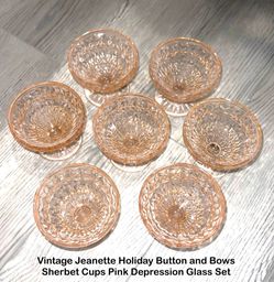 7 Sherbert Cocktail Glasses Holiday Pink Buttons and Bows Jeannette Glass Company Vintage