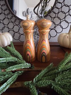 Hand-turned laminated wood salt & pepper mills, signed ‘Mr. Dudley’$45San Diego, CA