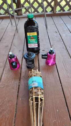 New 3 quart Bottle Tiki Torch Citronella and Cedar Oil, 2 New Tabletop Torches, 1 Used Bamboo pole Torch. All Sold Together.$15Sunset Valley, TX
