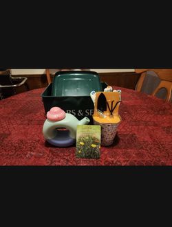 Vintage Green Metal Enamel Bulbs & Seeds Gardening Tin Container Bin Box with Handles and Lid. Comes with a Pair of Small Gardening Gloves, a Pail,$20Sunset Valley, TX