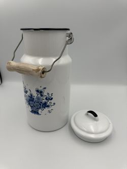 Emalia White Blue Floral Enamelware Dairy Milk Jug Can & Wooden Handle With Lid$40Black Diamond, WA