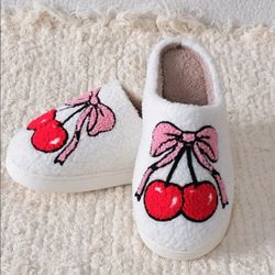 Women's White Sherpa Slippers with pink Bowknot and Cherries detail size 7.5/8-Valentine's Day Gift 💖✨️🍒$10Phoenix, AZ