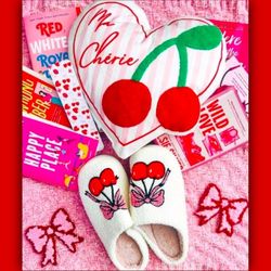 Last Minute Valentine's Day Gift Cherries Heart Shaped Pillow & Sherpa Slippers w/ Bowknot Cherries Size 7.5/8💖✨️🍒$20Phoenix, AZ