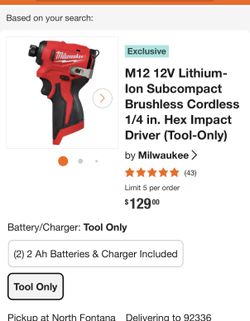 M12 Stubby 1/4” Hex Impact Drill Brushless $85Arrowhed Farm, CA
