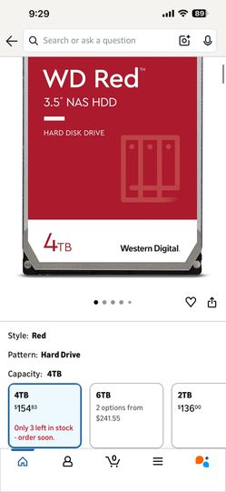Western Digital 4TB WD Red NAS Internal Hard Drive HDD - 5400 RPM, SATA 6 Gb/s, SMR, 256MB Cache, 3.5" - WD40EFAX$125West Hollywood, CA