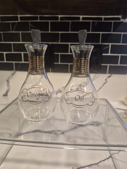 Pyrex Glass Oil & Vinegar Gold Stripes Black Lids 1960s Cruet Set$30Santee, CA