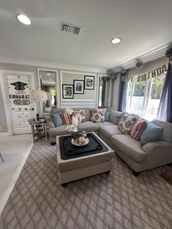 Green grey Custom-made Sectional Sofa Couch, ottoman and pillows. Always covered.$550Placentia, CA