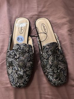 Atalina women's mules feature a black Paisley patterned fabric upper adorned with rhinestones and decorative rivets.$15San Francisco, CA