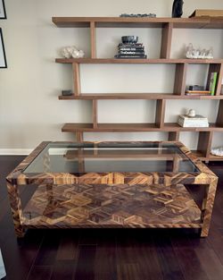 Beautiful designer glass top large coffee table - Brinkley by Made Goods - natural banana bark - retails for $3600$1,950Irwindale, CA