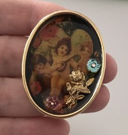 Vintage Reverse Painted Flower Rhinestone Oval Gold Tone Angel Brooch $23Mahwah, NJ