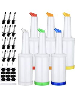 Ruisita 6 Pack Plastic Pour Bottles with Stainless Steel Pourer - Tapered Spout for Liquor and Juice Store (34 Ounces, Multicolor)