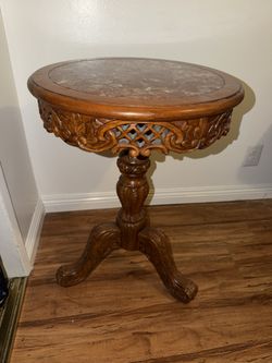 Victorian Style Carved Fruitwood and Marble Inset Pedestal Side Table Royola Pacific$1,000Irwindale, CA