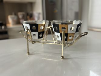 Vintage 60s MCM Hazel-Atlas Harlequin Black and Gold Snack/Chip Bowls With Gold Metal Holder$125Seattle, WA