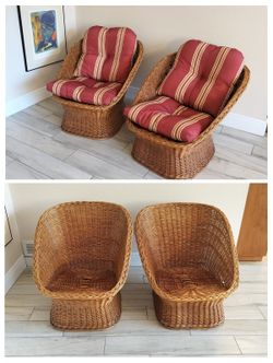 Pair of Vintage Rattan Barrel Pod Bucket Chairs With Cushions likely produced in the 1960s or 1970s.$295Orlando, FL