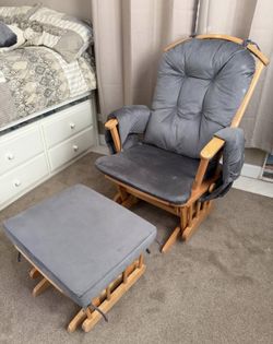 Dutailier Wooden Sleigh Glider Reclining Chair With Ottoman Set. Gray Cushions Included. $100Prospect Heights, IL