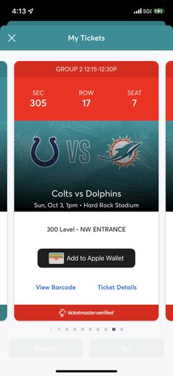 Colts @ Dolphins Oct 3 Tickets$120Pembroke Pines, FL